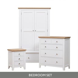Fill your bedroom with heaps of practical and attractive storage in one fell swoop with this beautifully crafted set. Painted sophisticated and calming white, with lacquered oak and high quality oak veneer tops offering contrast, you get a double wardrobe with full width hanging space and a drawer for bulky items, a pair of 3-drawer bedside tables to keep night-time must-haves close to hand, and last but not least, a 2 over 3 chest of drawers for all your smalls, T-shirts and accessories. Discreet but stylish metal handles add a smart finishing touch.