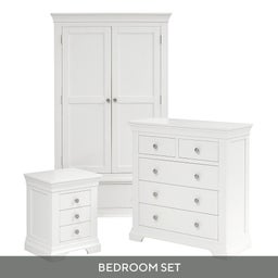 The bright, fresh appeal of this beautiful set will help transform your bedroom into the calm and relaxing space it needs to be for you to while away the stresses of the day. Painted in a soft white, each piece is supplied with both white wooden and brushed steel handles so you can choose which will suit your décor best. The set includes a double wardrobe with generous hanging space and a full width drawer for bulkier knitwear and jeans, a 2 over 3 chest to take care of T-shirts, underwear and other items, and a pair of three-drawer bedside cabinets so you can stow away all your night-time essentials.