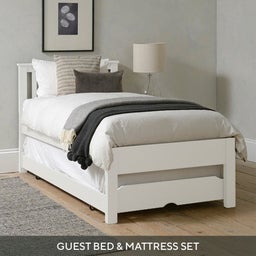 If you are looking for a comfortable and stylish guest bed that will fit perfectly in your guest bedroom, the look no further than the Pensham Pure White Guest Bed and Trundle. This beautifully designed bed features a solid pine frame that has been painted white, and comes with two mattresses – one for the bed and one for the trundle. The trundle can be pulled out and kept flat, or propped up so it's level to create a spacious and comfortable double bed.
