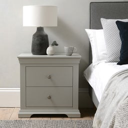 With room for all your bedtime essentials in its spacious two drawers and space on top for a reading lamp, the pebble grey paint finish of this smart and sturdy bedside table will sit happily in just about any décor, be it modern or traditional, and will make the ideal companion for one of our Chantilly beds. In an elegant design that’s eye-catching without being overly fussy, it comes complete with painted wooden handles or metal ones so you can apply the finishing touch according to your taste.