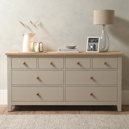 Perfect for larger bedrooms, our Chester Limestone 8-drawer chest is low and wide, with its four smaller drawers set over four larger ones to keep all your items organised and out of sight. Crafted to last, the frame is finished in our soft Chester Limestone paint, inspired by the calming tones of the Cotswold countryside.