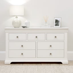 The Chantilly Warm White 3 over 4 Drawer Chest of Drawers is both functional and chic. This low, wide chest is perfect for making use of the space under windows, and the top can be used for extra storage or display space. The chest is painted in a soft white, which will give any room a lift, especially when combined with other pieces from the elegant Chantilly range. With seven drawers, there's plenty of space for clothes and accessories, and the chest comes with two sets of handles - white wood and brushed steel - so you can tailor its appearance. Storage has never looked so good!