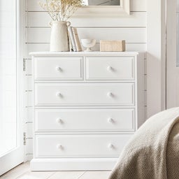 A thoughtful design graces our Pensham White pine chest of drawers. With two smaller drawers on top and three deeper drawers below, the bright white painted finish, coupled with a solid wood frame, is both beautifully timeless and robust, so it'll complement décor schemes both modern or more traditional, for many years to come.