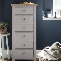 When space is tight but you need plenty of storage, the only way is up. Standing just over a metre high and slotting into smaller spaces, this narrow chest will still hold lots in its six roomy drawers with polished metal handles. Ideal for all over the home, its smart grey painted finish and lacquered oak and high quality oak veneer top will work well either as a standalone piece on a landing or in a hallway, or combine beautifully with other items from the range as part of a complete look.