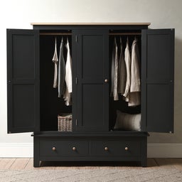 Sure to be a striking addition to your master bedroom, there’s enough hanging space behind the three panelled doors to satisfy the most frequent clothes shopper, plus there are two roomy drawers for all your bulkier bits like jumpers and jeans. The contrast of the charcoal finish, lacquered oak and high-quality oak veneer makes for a timeless piece that will blend with most decors. Delivered with a choice of two handles, you can either elect to use modern polished metal handles or country classic wooden knobs and we think there’ll be plenty of space to line up your shoe collection inside too.