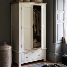 Add a touch of modern country sophistication to your bedroom with this effortlessly elegant double wardrobe. With full width hanging space to hang all your clothes and extra room at the bottom for your shoes makes this the perfect addition to your room. The added drawer at the bottom will hold any bulky items and with a choice of polished metal knobs or wooden knobs give the wardrobe a smart finishing touch. Painted in a classic cream that will suit both traditional and modern decors, finished with lacquered oak and high-quality oak veneer tops which provide an attractive contrast.
