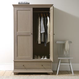 A sturdy and simple design, our Winchcombe Smoked Oak double wardrobe opens to reveal ample hanging space with a roomy bottom drawer.
