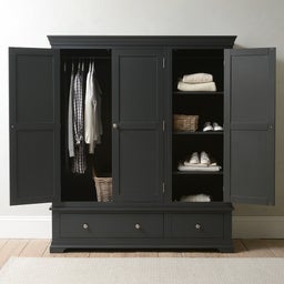 This beautiful triple wardrobe will bring drama to your bedroom. Finished in a matte black paint it will create drama and bring character to your room while also boasting ample storage space. Behind the double doors you will find a full width hanging space and, behind the third a trio of shelves to keep folded jumpers, jeans or even shoes neat and tidy. Two drawers beneath offer you extra space for smaller items of accessories. Both painted and antique style silver handles are supplied so you can add a custom touch to this stunning wardrobe.