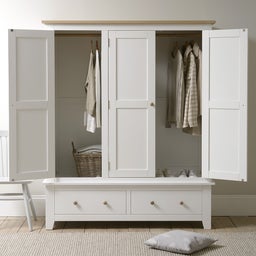 Sure to be a striking addition to your master bedroom, there’s enough hanging space behind the three panelled doors to satisfy the most frequent clothes shopper, plus there are two roomy drawers for all your bulkier bits like jumpers and jeans. With a crisp white paint finish that gives it modern country-style appeal, it has a lacquered oak and high quality oak veneer top to provide smart contrast. Polished metal door and drawer handles add attractive and practical detail, and we think there’ll be plenty of space to line up your shoe collection inside too.