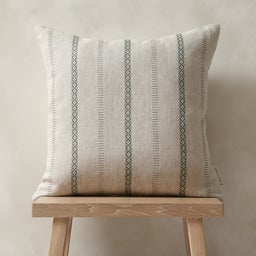 Lovingly printed and sewn here in the UK, this 100% linen square cushion features Madder Cutch & Co’s Blossom Stripe in a Kingfisher colourway.