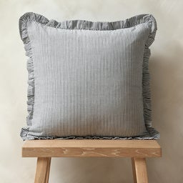 Softly striped and finished with delicate ruffle edging, this cushion adds character and texture to your sofa. Its classic country-inspired design brings a subtle, lived-in charm.