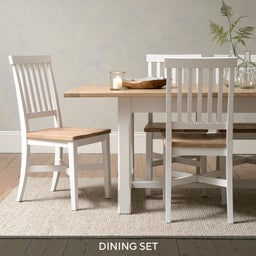 Sitting around chatting with family and friends, spreading out the Sunday papers, or tucking into a roast dinner – our dining tables are right at the heart of modern life. That’s why we’ve made the expertly crafted one in this set extendable to offer the versatility you need. It starts out at 180cm, but extends to 220cm or 260cm, depending on what’s going on or how many you need to feed. With a oak and high quality oak veneer top that’s been waxed to cope with all the hustle and bustle, and a pure white paint finish on the frame, it’s as beautiful as it is practical. And we haven’t forgotten comfort either, as it comes with six equally handsome dining chairs