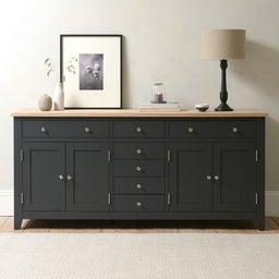 Our Chester Charcoal Grand Sideboard is a stunning addition to any dining area or room, not only providing masses of storage for crockery, tableware and accessories but also giving you plenty of surface space which is great for entertaining as you can layout an impressive buffet or set up a serving area. The natural oak top is finished with oak veneers and a white wax and clear lacquer to protect the surface from minor bumps and scratches.