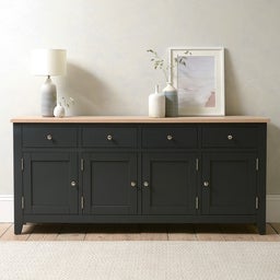 A real showstopper. Expertly handcrafted using a solid oak framework, our Chester Charcoal Extra-Large Sideboard promises durability and resilience to the hustle and bustle of every day life. A grand and impressive piece of furniture designed to stand proudly in your home, this timeless large grey sideboard offers an abundance of storage space with four large cupboards and four equally roomy drawers. Adjustable shelves allow you to tailor the cupboard space to suit your storage needs too. A real stalwart of timeless, handcrafted furniture. Characterised by a smooth charcoal painted finish and white-wash oak framework tops, the whole collection is built using mortise and tenon joints to ensure its strength and durability in your home for many years to come.