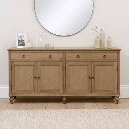 A real showstopper in the range, our Elkstone Oak Extra Large Sideboard blends elegant design with contemporary hardware in antiqued black - a perfect match for the oak finish. A handcrafted solid oak top proudly showcases the knots and grain of this natural wood, while mortise and tenon joints provide a strong framework to ensure long lasting durability. This large sideboard has adjustable shelves too, so you can make the storage work best for you.