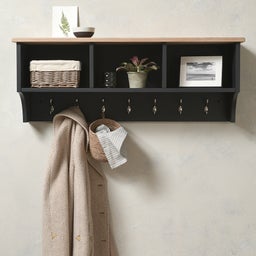 Perfect to bring a little organized harmony to your entrance way this stylish hook and shelf set has three large cubbies; ideal to house hats, gloves or a small umbrella the 7 sturdy hooks below will take care of coats and scarves too. The white wash oak veneer top also offers an extra surface ideal to display photos or favourite ornaments.
