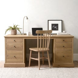 Keep essentials close to hand on the generously sized desktop and organise smaller items in the thoughtful drawer dividers below. Elegantly finished on both sides, our Elkstone Mellow Oak desk can be placed in the middle or corner of your workspace.