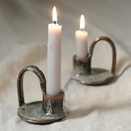 Ceramic candle holder with a handle glazed with a tawny speckle. This candle holder is a fresh take on a classic design and will have you feeling like wee willy winky, plus it makes a super cozy addition to any room! Dishwasher safe. Microwave safe.