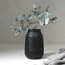 This beautiful black vase with its grooved pattern is perfect for a display. On its own or with a bouquet of flowers, it is the perfect addition to any home décor.