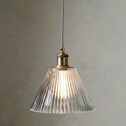 The Eliza pendant casts a warm, inviting glow. Its antiqued brass fitting is paired beautifully with the modern ribbed glass shade, perfect as a statement piece or positioned in a cluster, hung above a kitchen island.