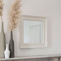 Our modern style square mirror with its chunky wide wooden frame will look great as a focal point in any living space. Finished in a warm white paint colour.