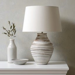 This beautiful wooden lamp features a whitewashed finish and ribbed detailing, finished off with a white shade to create a sleek natural feel.