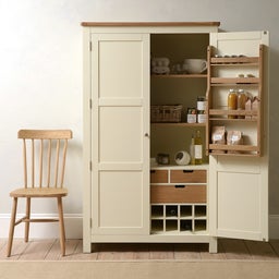 From the outside, the clean lines and striking cream paint finish and contrasting satin lacquered oak top on this beautifully crafted piece of furniture will impress. But throw open the simply panelled double doors and a whole world of versatile kitchen storage opens up in the form of shelves, racks, drawers and even a wine rack, ready to look after spices, packets, jars, tins and more. Offering timeless style that will suit any décor, it will work equally well in modern and traditional kitchens.