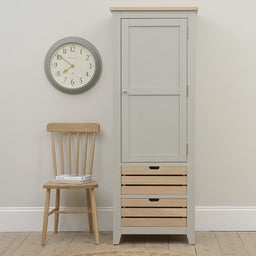 With its stylish Dove Grey finish this smart larder will make for a conversation starter in any kitchen. Behind the single door you will find 4 generous shelves with 2 crate style drawers beneath. The door storage racks are perfect to hold baking trays, spices or cereals while the exposed lower crates are the ideal space to keep potatoes and hardy root vegetables cool, dry and away from sunlight.