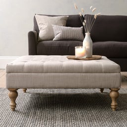 A sure-fire way to bring luxury and design kudos to your living space, this versatile coffee table can be used as a footstool to rest your tired feet on at the end of a long day. Finished with deep hand buttoning this charming table has been finished in a neutral stone linen with light oak legs meaning its perfect for your existing decor style. The wide open top means you can safely gather round to play a board game with friends and family or use it to display your favourite coffee table books.