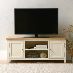 An effortless blend of function and beauty, this simple cream TV stand provides essential storage for your living area. Featuring useful shelves and cupboards, it contrasts a beautiful paint finish with a wood top.